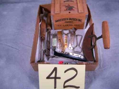 box-dough cutter, Budweiser wood gift box, old kitchen gadgets