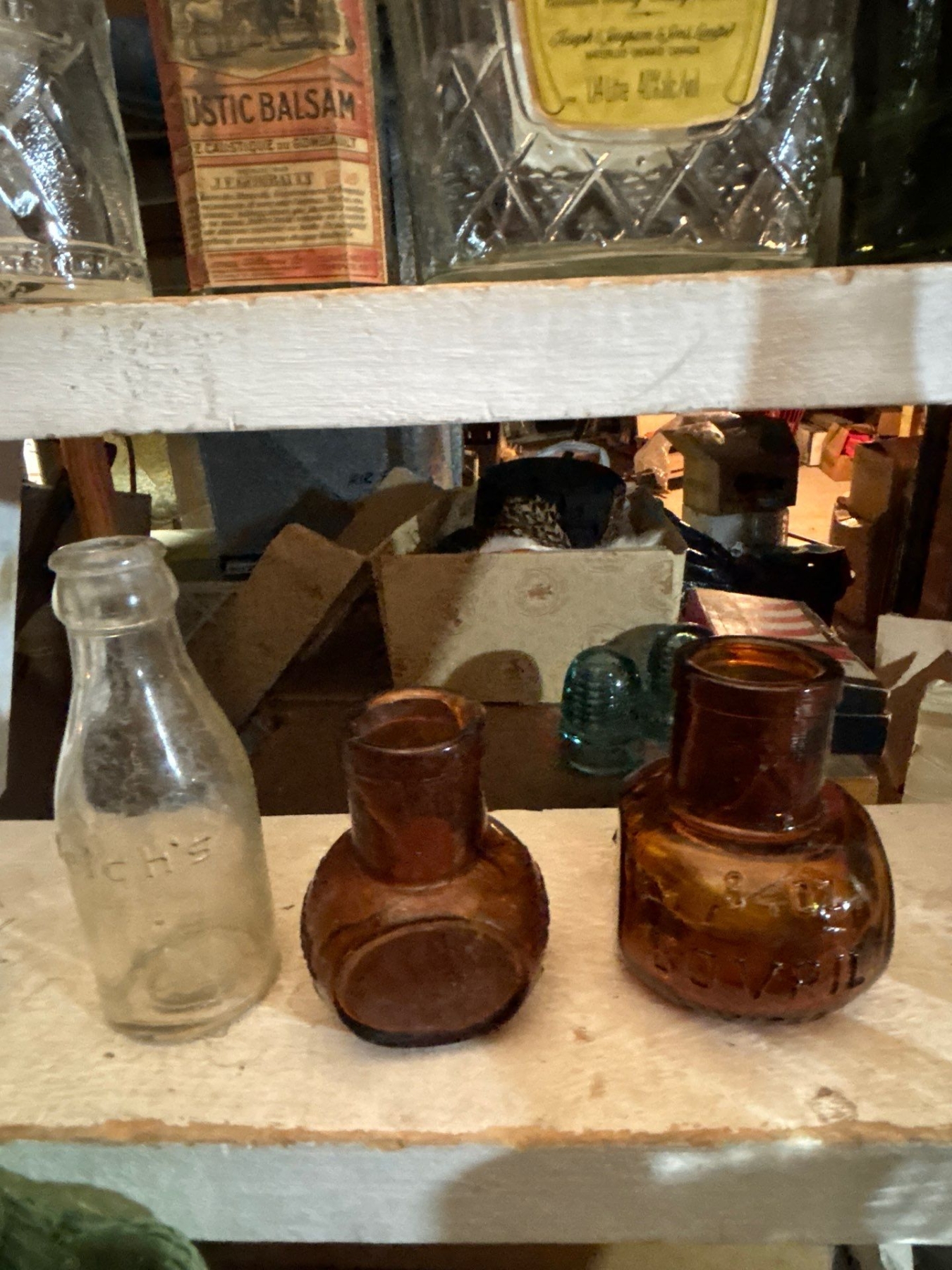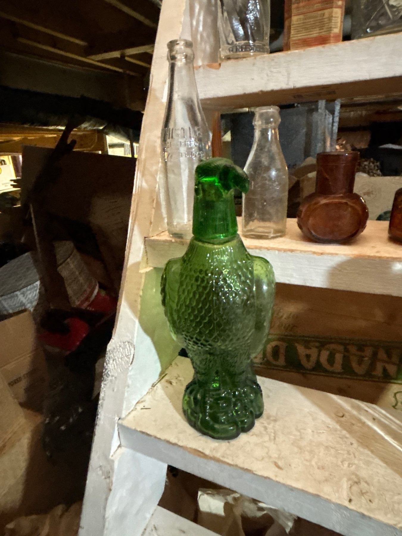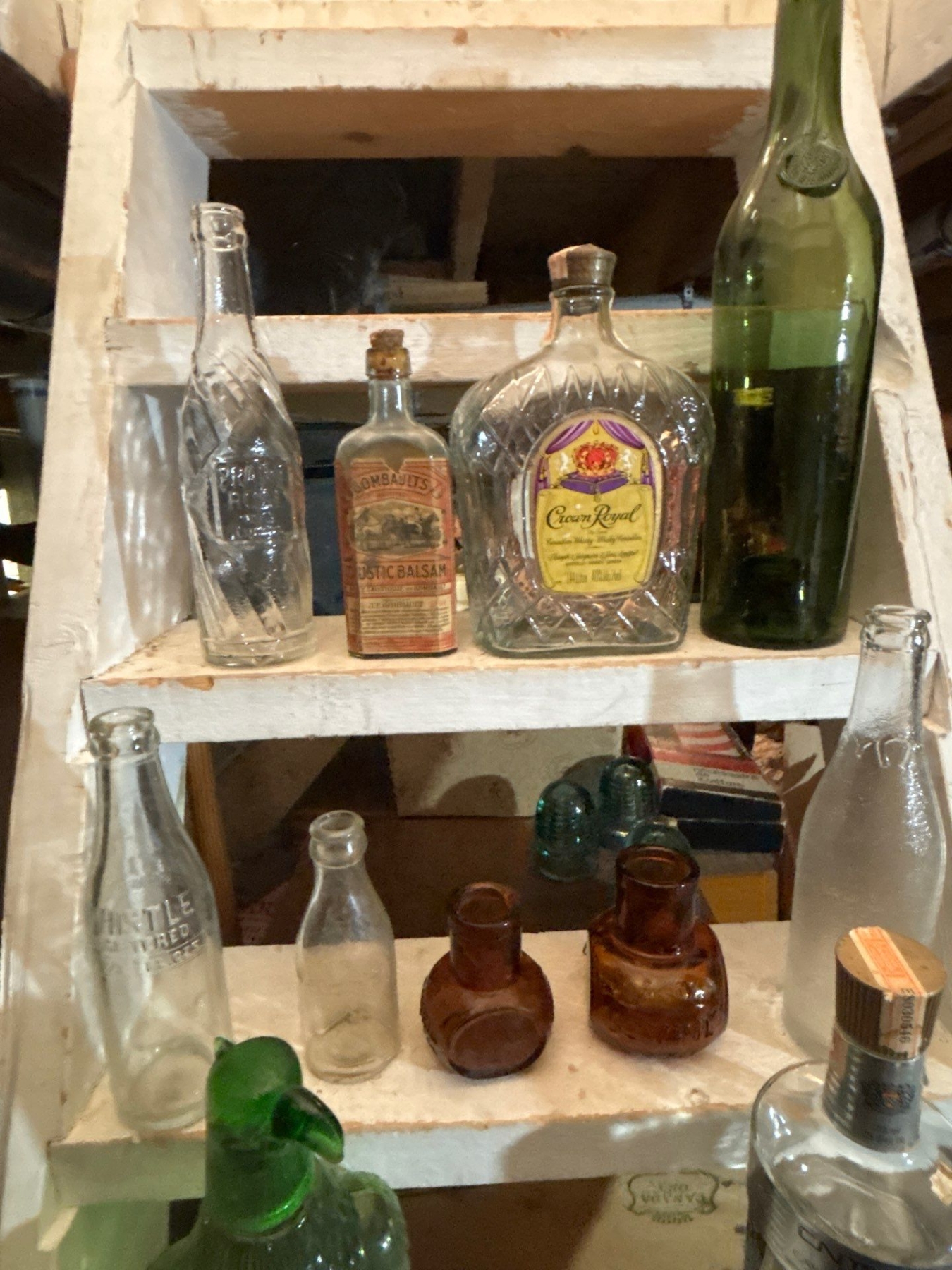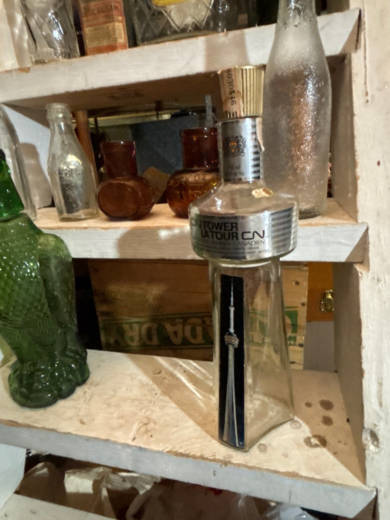 collection of random bottles crown royal whistle Welsh‘s juices a CN Tower liquor bottle from the 70s 80s. small apothecary bottles, Amber and color and an Green Bessi Italian American Eagle Decanter