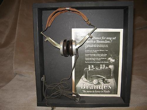 1925 ad for Brandes Superior Headphones and a functioning set of the headphones featured in the ad.