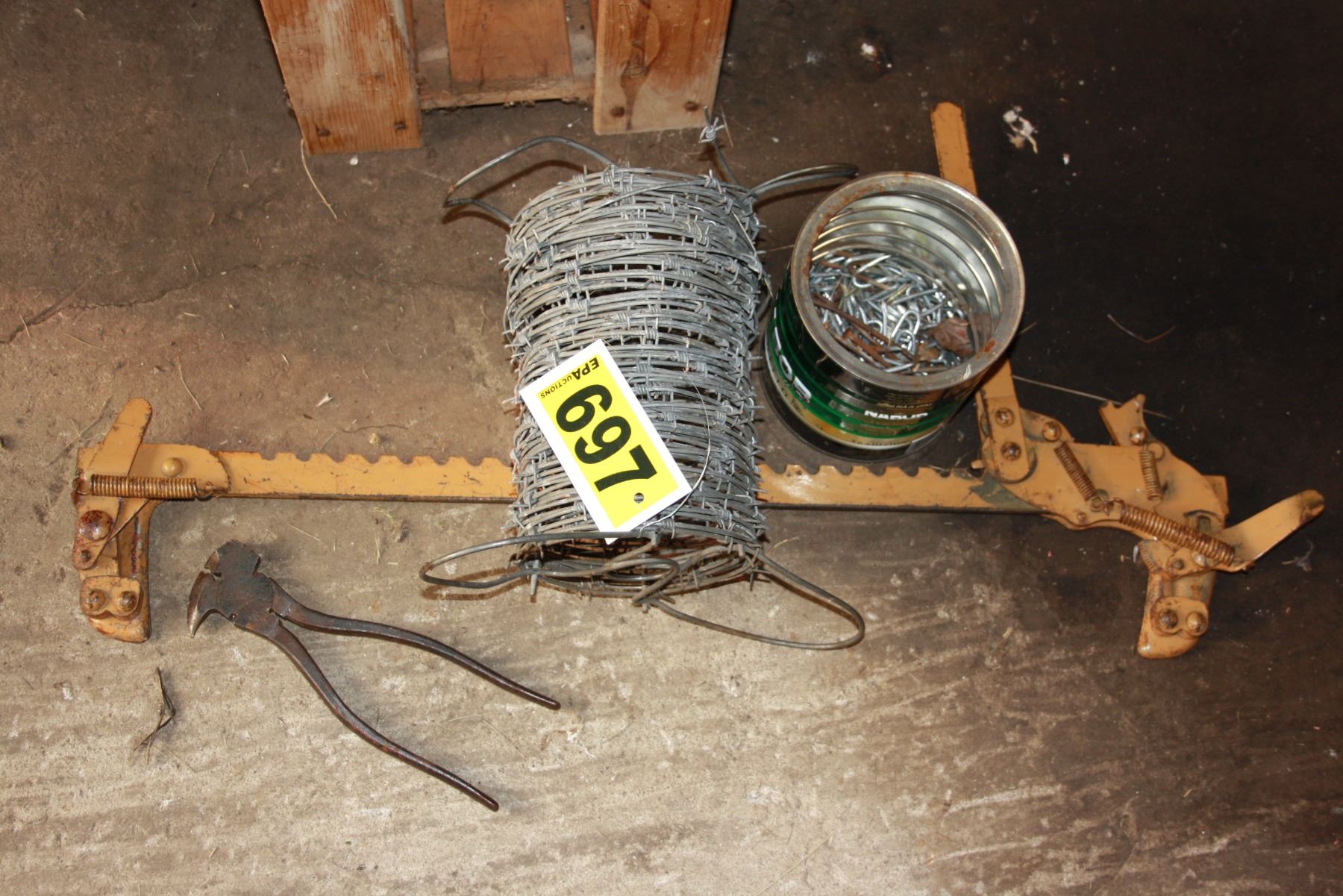 wire stretcher, particle roll barbed wire, fencing pliers and staples