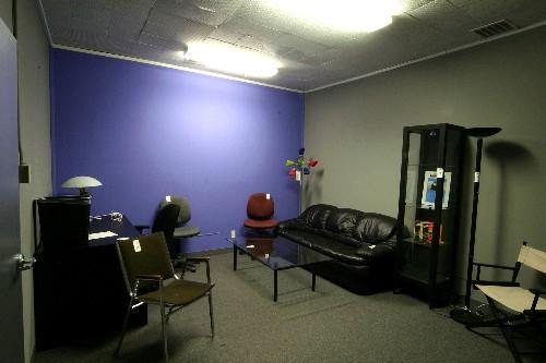 sofa, desk, 5 chairs, coffee table, display case, 4 lamps, plant - room 112