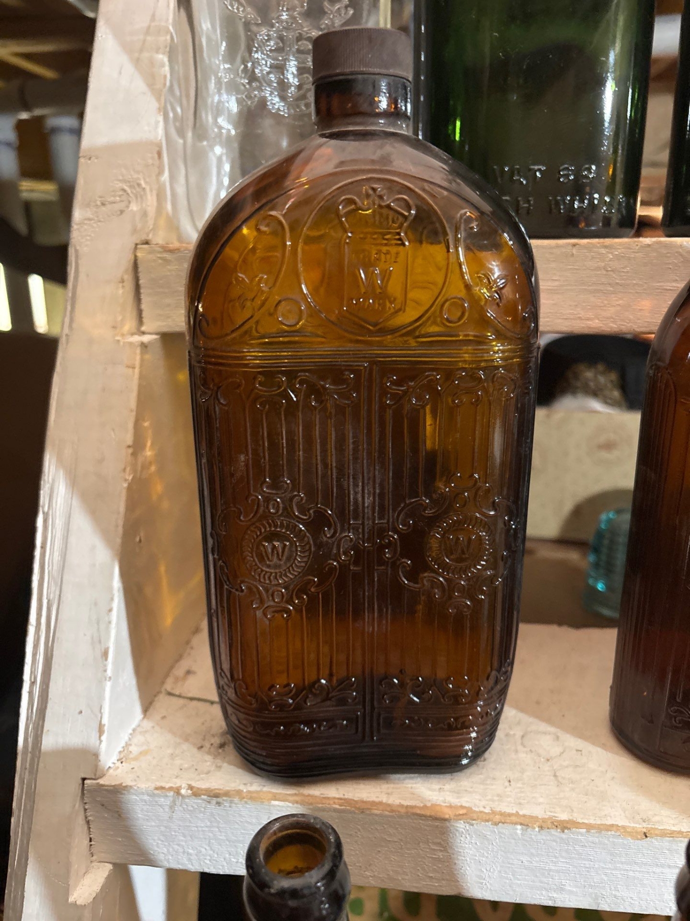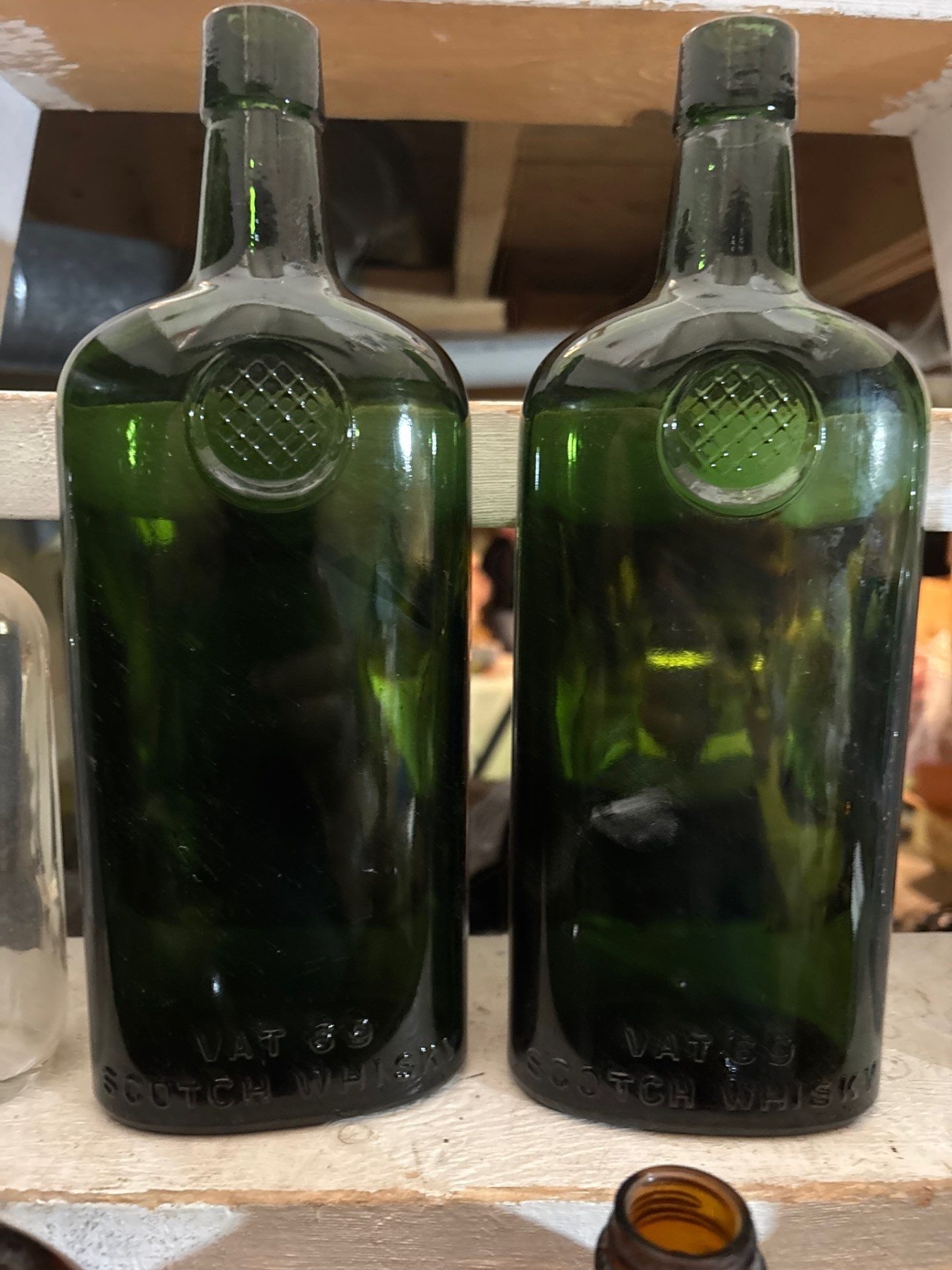 vintage High Value bottle collection, green scotch, Vat 69 Scotch Whisky $80-$120 each Original Vintage Hiram Walker Amber Whiskey Bottle Embossed "W Trade Mark x2