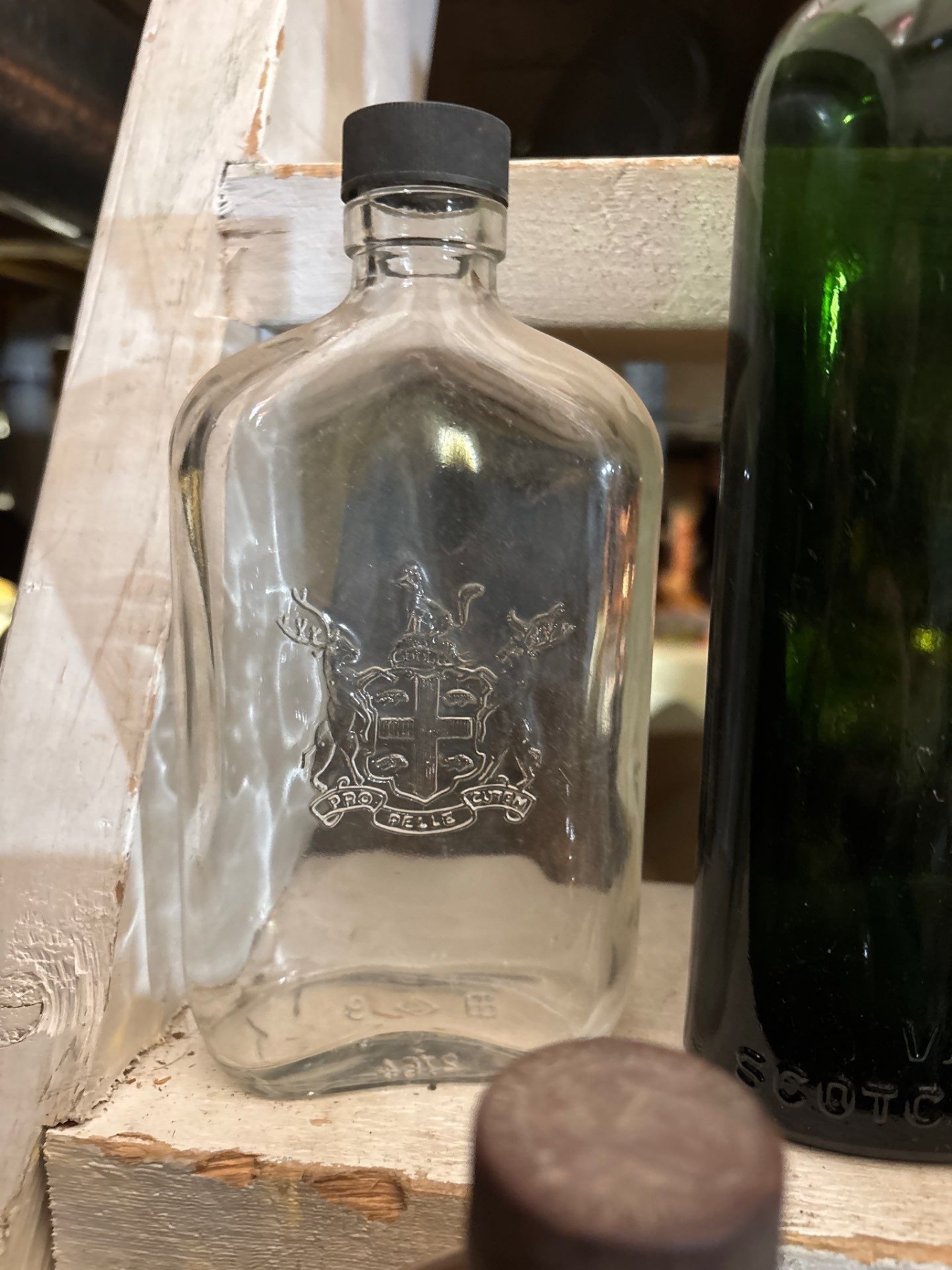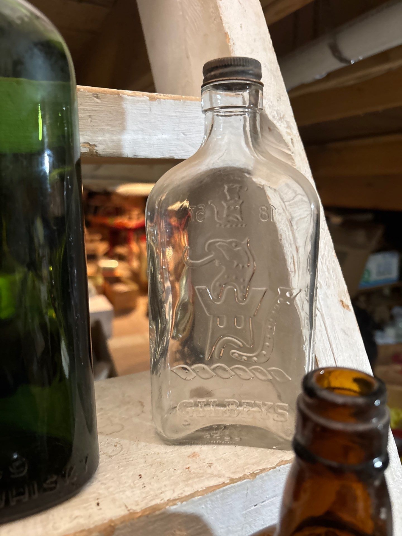 and two small clear glass whiskey bottles brand Gilbey's. all in great condition no chips.
